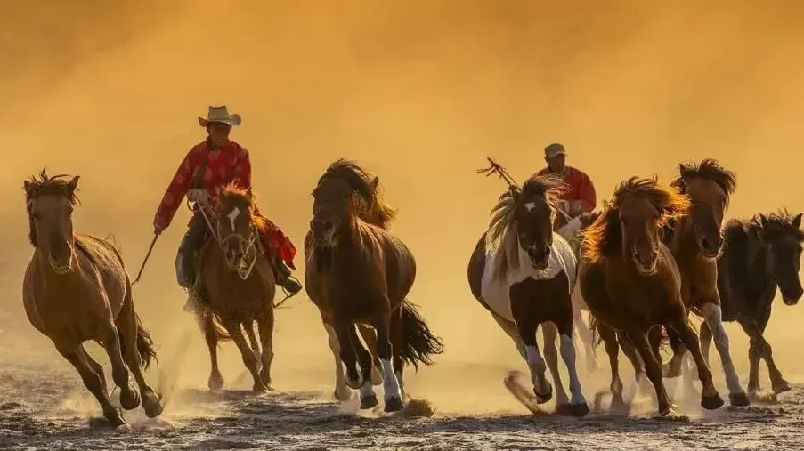 【金秋牧野·骏马奔腾】 广袤金色草原上,数十匹骏马如离弦之箭般驰骋,鬃毛飞扬间尽显力量与野性之美。专业骑手驾驭马群变换队形,在落日余晖中演绎"万马奔腾"的震撼场景。