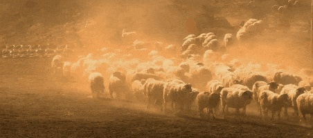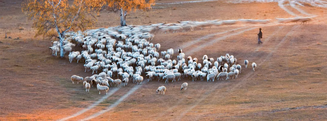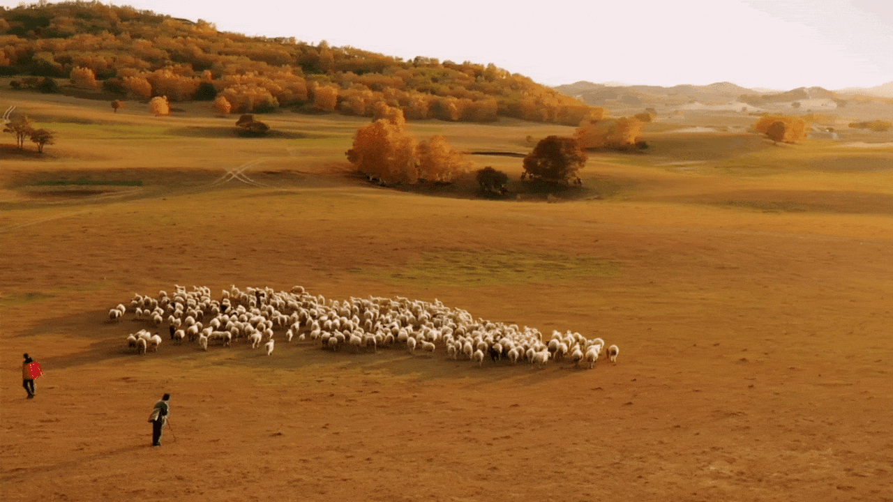 肥嘟嘟的小羊们好像滚圆的棉花糖,牧羊人骑着白马,悠闲的跟在羊群后。