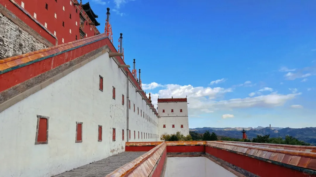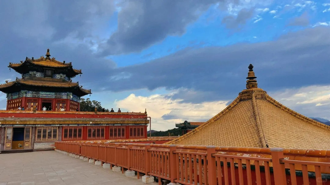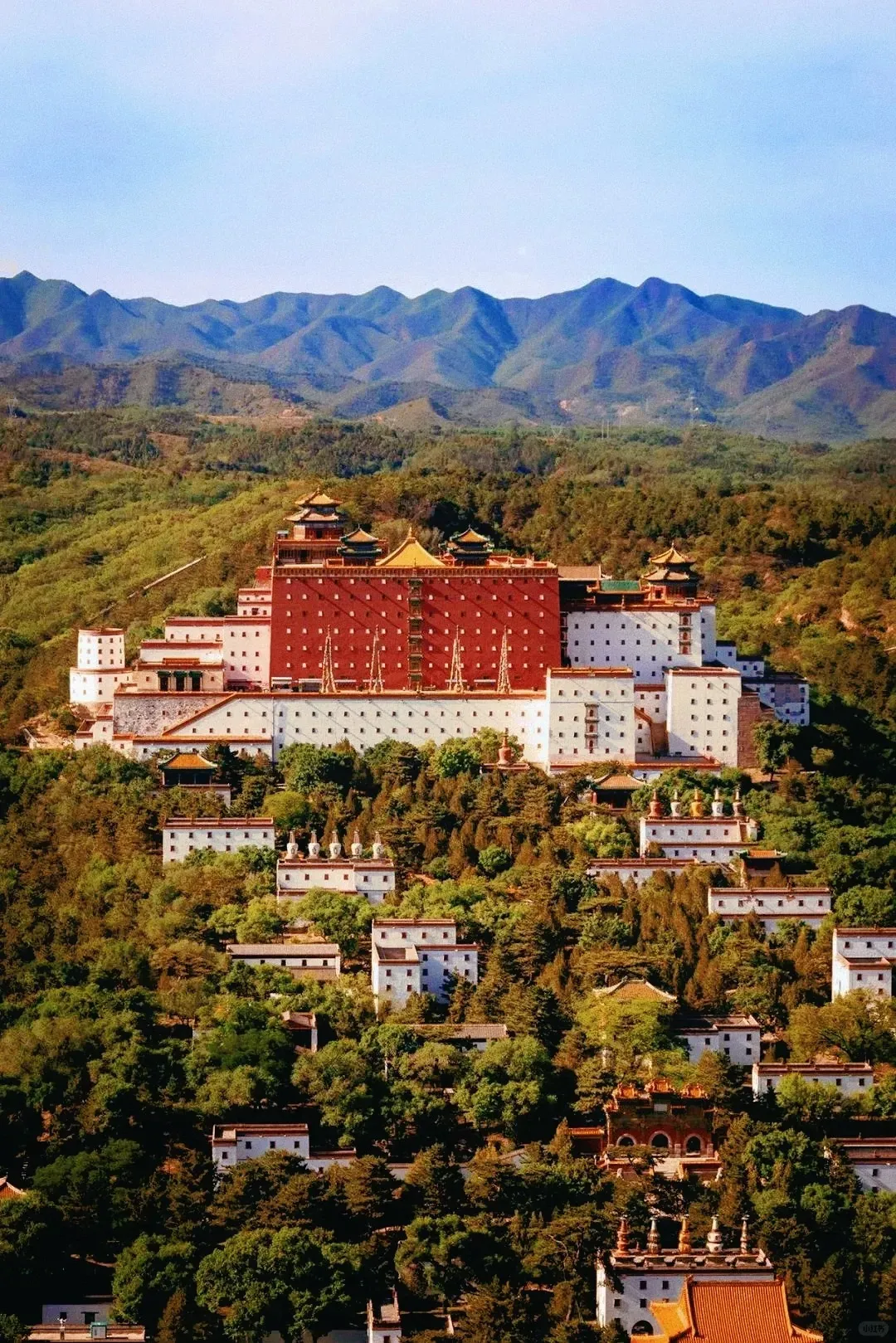 普陀宗乘之庙的主体建筑大红台,在秋日阳光下更显雄伟,顶部的镏金鱼鳞铜瓦(用14000余两黄金打造)熠熠生辉,与秋叶的金黄相互映衬。