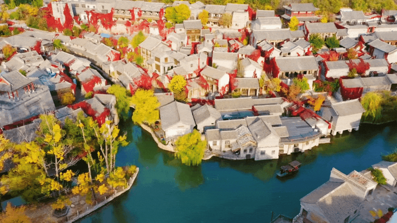 俯瞰长城脚下的『烟雨江南』小镇也换上秋日装扮,变身色彩绚丽的红叶小镇。
