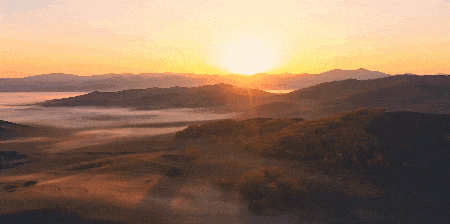 薄薄的平流雾像是给草原披上的一层轻纱,朝霞的光芒层层叠叠的洒下,远山在不同的光影下徐徐展开一幅水墨国风的画卷。