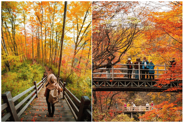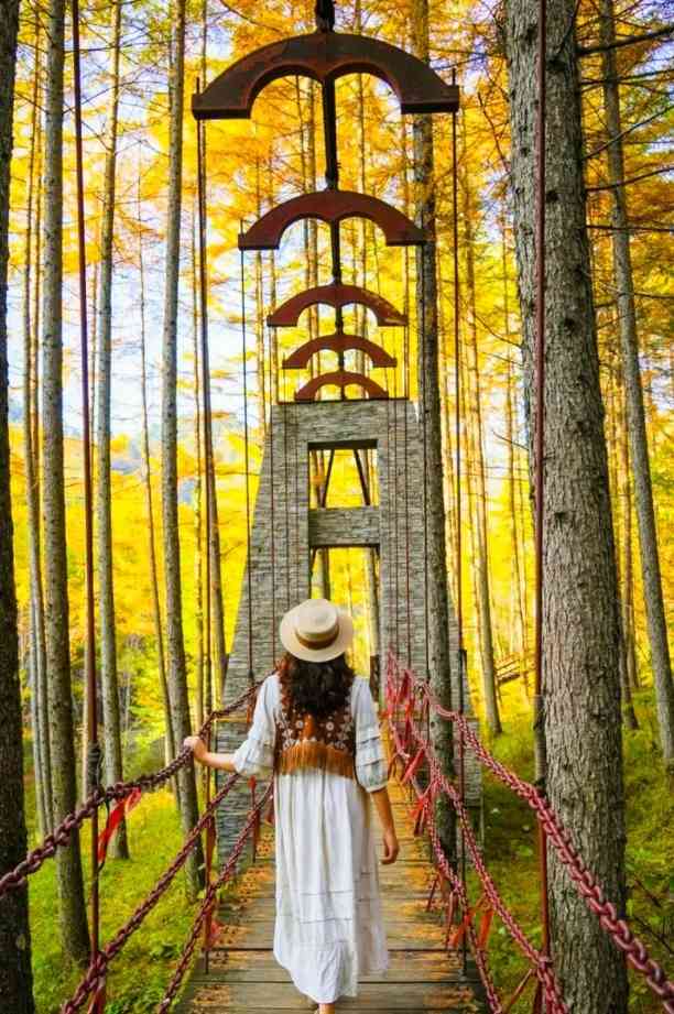 前往【情人谷片区】,山下的情人谷最适合秋天来打卡散步数百亩的水杉、落叶松将这里装扮的温和且内敛走在木质吊桥上踩着松软的落叶,放松至极。