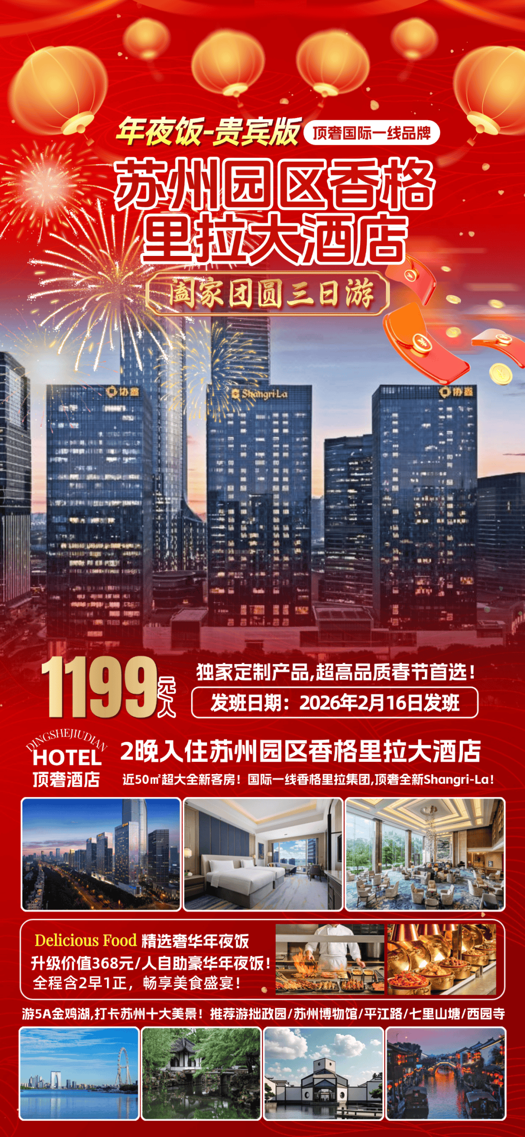 “年夜饭1199-贵宾版”『2晚苏州园区香格里拉大酒店』顶奢国际品牌◆金鸡湖畔◆368元/人自助年夜饭◆近50㎡超大客房全新设施