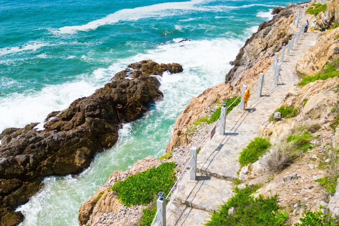 ---早餐后,早起深呼吸,享受新鲜空气。推开窗户拥抱大海,在阳台上看着无边无际的大海,神清气爽,【鼎龙湾日出】在天气允许的情况下,早上可自行去海边看日出,漫步在海边,在清晨的海风吹拂下,静待海上日出的到来。前往【历史文化古城】 ——雷州(车程约1小时),前往【茂德公鼓城】(约45分钟) ,青石红砖红瓦典型的雷派建筑风格 , 恢宏的城墙内, 城楼交错,其建筑形态古色古韵又透出现代气息,具有雷州半岛别样的风情, 走进 雷州茂德公古城,仿佛穿越时空隧道, 回到一千多年前的古雷州。 走在古城的大街小巷上, 踏着一 千多年的历史,仿佛看到雷州古城的繁荣和喧闹; 走近古城的大戏楼, 仿佛听到飘逸回荡的雷音古韵…前往游览【菠萝的海】(约45分钟)种植面积高达35万亩,一望无际的菠萝田地此起彼伏,大地曲线优美,蔓延到天边。菠萝园内一年四季色彩斑斓,与散落在田野里的小村庄和巨大的风车构成一幅独具魅力的热带生态农业画卷。当你踏进这片五彩斑斓的土地时候,就会被眼前“排上倒海”菠萝海包围了,令人心旷神怡、悠然自在。前往【祖国大陆最南端——南极村】(车程约1.5小时)。中国长寿之乡——徐闻,一路观赏旖旎的热带风光,【南极村】世代居住于此的村民,以大海、珊瑚石为家,珊瑚石是海石,不怕咸涩海风的侵蚀,并且它本身具有石灰特点,遇风雨淋洒会产生一种自然粘合的胶接板结作用,它很轻,所以垒造的屋墙相当坚固。它冬暖夏凉,透气吸潮,是“会呼吸的房子”。车观【南方雪原】----你可以看到一片片白花花的,明晃晃的犹如镜子一般的大片田地,那就是徐闻县的【千年古盐田】参与制盐(约30分钟)。这里地处热带,全年日照时间长,海水蒸发快,非常适合晒盐。土地含有丰富的矿物质。用原始的方法从海水中提取盐分,让人不禁感慨这份对传统的坚守与传承。在这片古盐田中,依然保留着许多珍贵的制盐遗址,古老制盐工艺展示着古人智慧。可以观赏到中国绝无仅有的景观——【合水线】(约45分钟)。游览中国大陆最南端的标志【角尾灯塔】,【渡琼作战指挥部】,如果说灯塔是法国文化在南端小镇诉说着历史沧桑,那么这座不太起眼的三层小楼则在讲诉着一段血泪交融的红色历史。