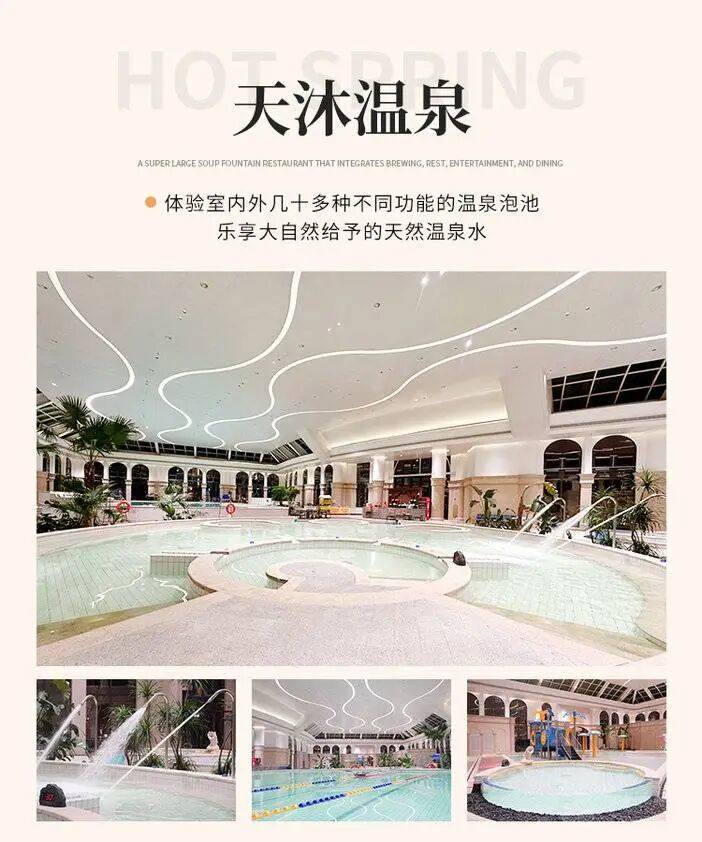 天沐温泉中心拥有罕见的高于医疗价值标准的疗养级偏硅酸、偏硼酸温泉资源,以开发“真温泉”的产品理念,建设近1方平方米的温泉休闲馆,配置有天淳SPA、养生食坊、静养时光休闲区、悦·书吧、FUN·运动潮玩馆、能量房等丰富产品,温泉沐浴区可畅游2200㎡的欧式水疗馆,体验户外30多种不同功能的天然温泉泡池,乐享大自然给予的恩赐。