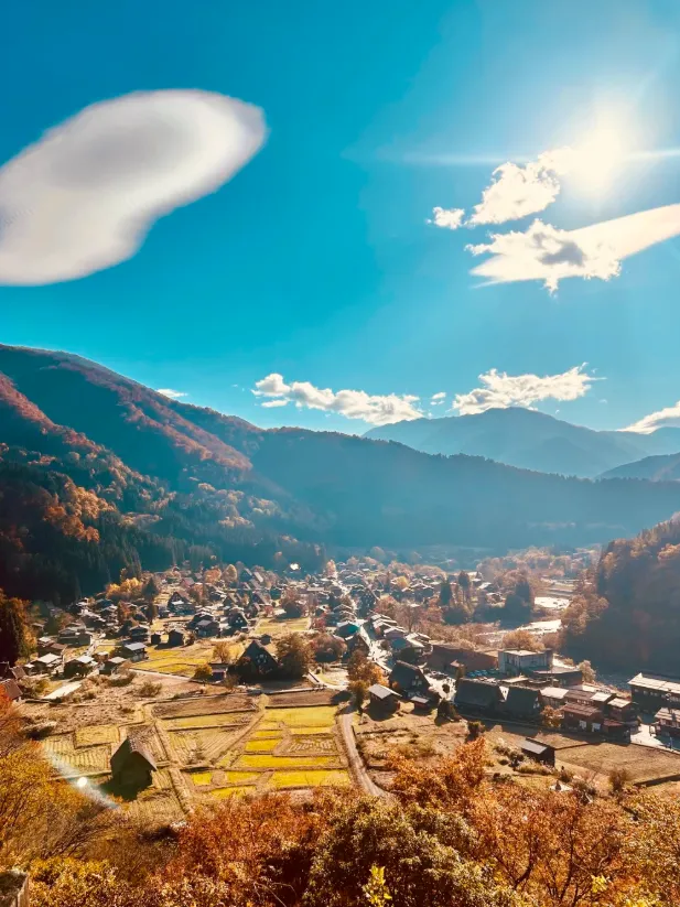 【荻町城跡展望台】荻町城跡展望台是白川乡的时光之眼,堪称合掌村落最动人的观景台。白天,古朴的茅草屋顶在阳光下泛着金色微光,宛如童话里的姜饼屋群落静静躺在群山怀抱中。而到了日暮时分,当千家灯火次第点亮,整座山谷便化作银河倾泻的梦境,你能看见村民们在蜿蜒的石板小路上往来,为夜间的点灯祭典做着最后准备。