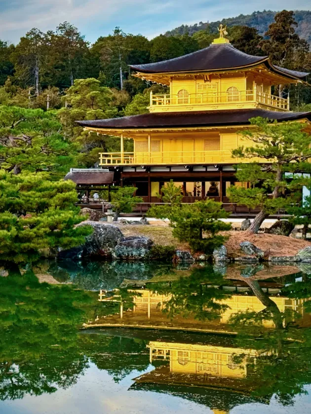金阁寺(鹿苑寺)是日本美学的巅峰象征,以贴满金箔的舍利殿闻名于世。这座始建于1397年的禅寺,原为足利义满的别墅,后改为佛寺。其金碧辉煌的楼阁倒映池面的绝景,四季皆成画卷,被联合国列为世界文化遗产。
