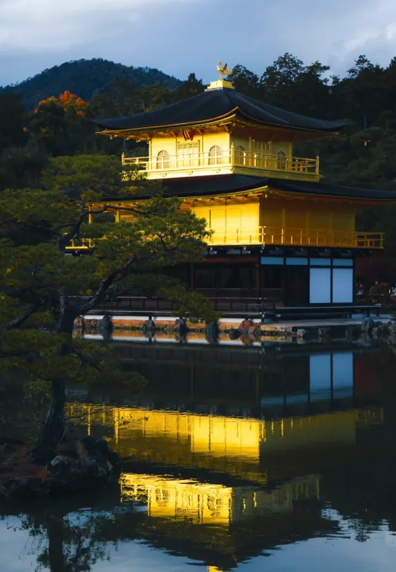 【金阁寺】金阁寺本名是鹿苑寺,由于寺内核心建筑舍利殿的外墙全部贴以金箔装饰,故昵称为“金阁寺”。寺院始建于1937年,原为足利义满将军(即动画《聪明的一休》 中利将军的原型)的山庄,后改为禅寺“菩提所”,曾因火灾被毁,又于 1955 年被复原。据说 以金阁为中心的庭园为“极乐净土”,与寺前的镜湖池相互辉映,尤其在晴天风景极好, 而这也成为了京都的象征。