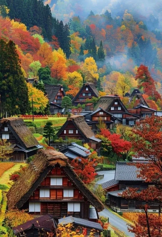 当秋色浸染飞驒山脉,白川乡的百年合掌造披上红妆。茅草屋顶的金黄与枫叶的赤焰在梯田层层晕染,宛如被神遗忘的调色盘。这里是日本唯一同时拥有「世界遗产+红叶百选」称号的奇境,秋日限定的治愈力满点!