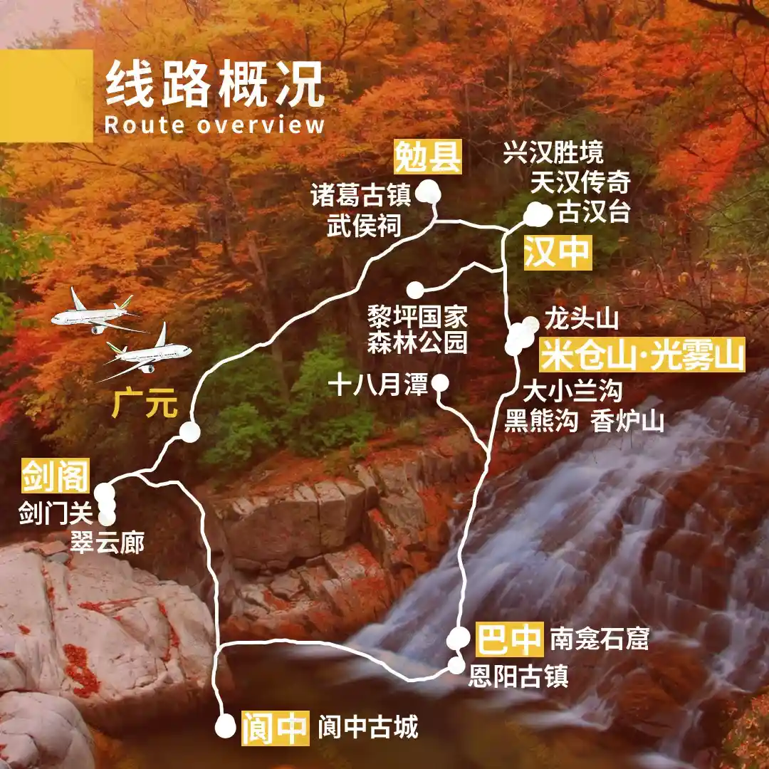 【广元往返】在最美红叶季,赏光雾山大全景,双飞8天时间,见识秦岭金秋盛景,2+1大巴,4晚四钻3晚五钻,50元高餐标下馆子,回程接机送到家门口~
