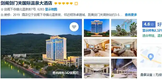 剑阁(5钻温泉酒店)*1晚:剑门关国际温泉大酒店或同级;