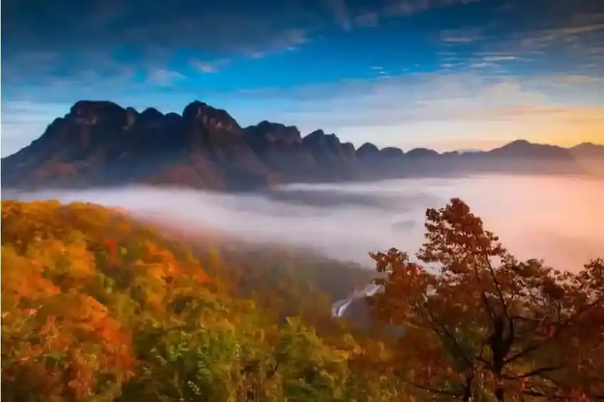 光雾山观赏红叶的时间长达1-2个月之久,第一阶段看红叶五彩斑斓,第二阶段看红叶层林尽染,第三阶段看红叶万叶飘丹,是其他赏秋目的地无法相比的