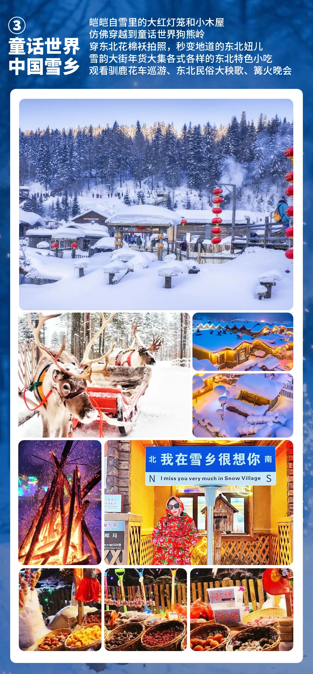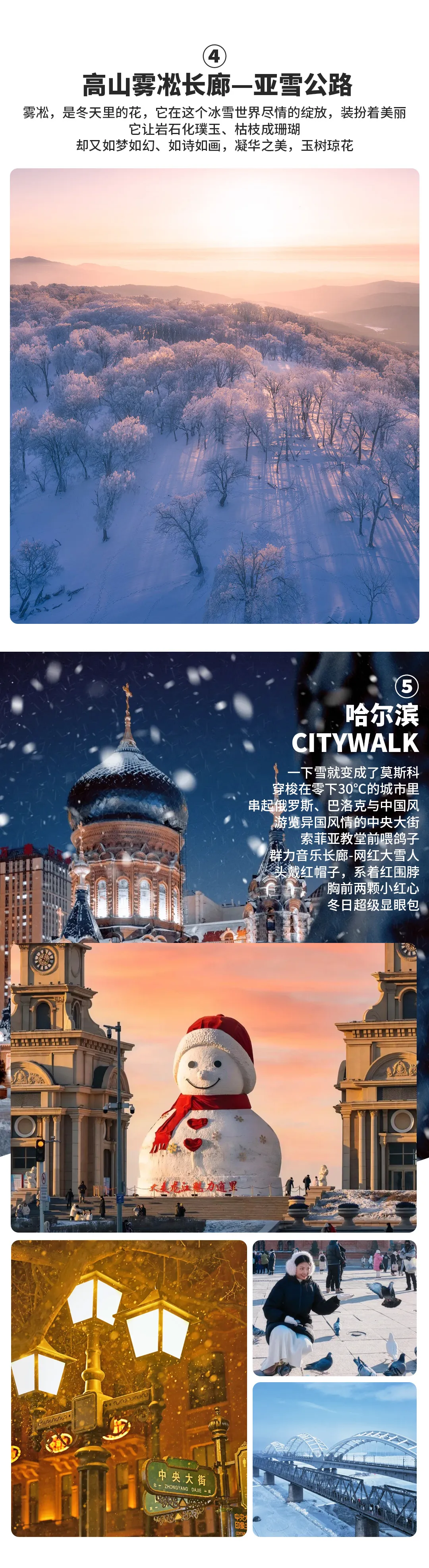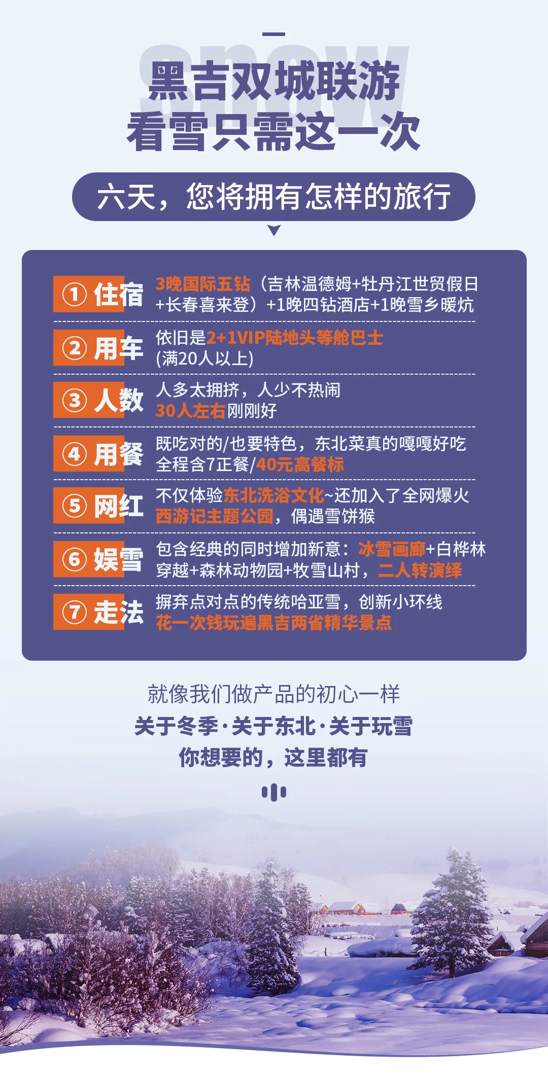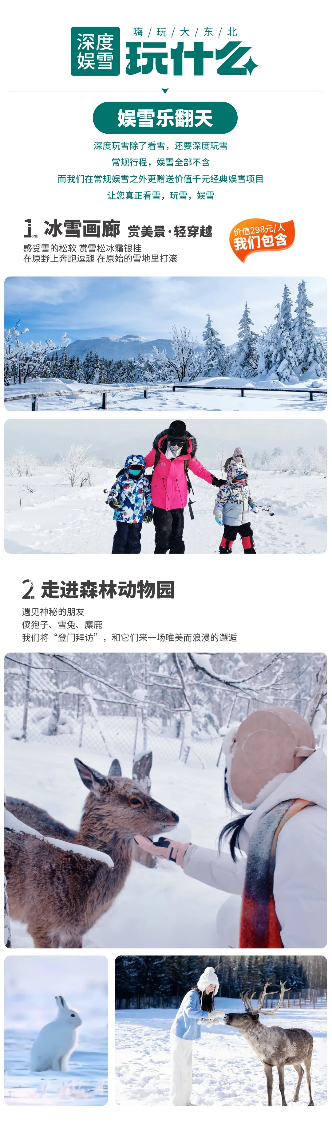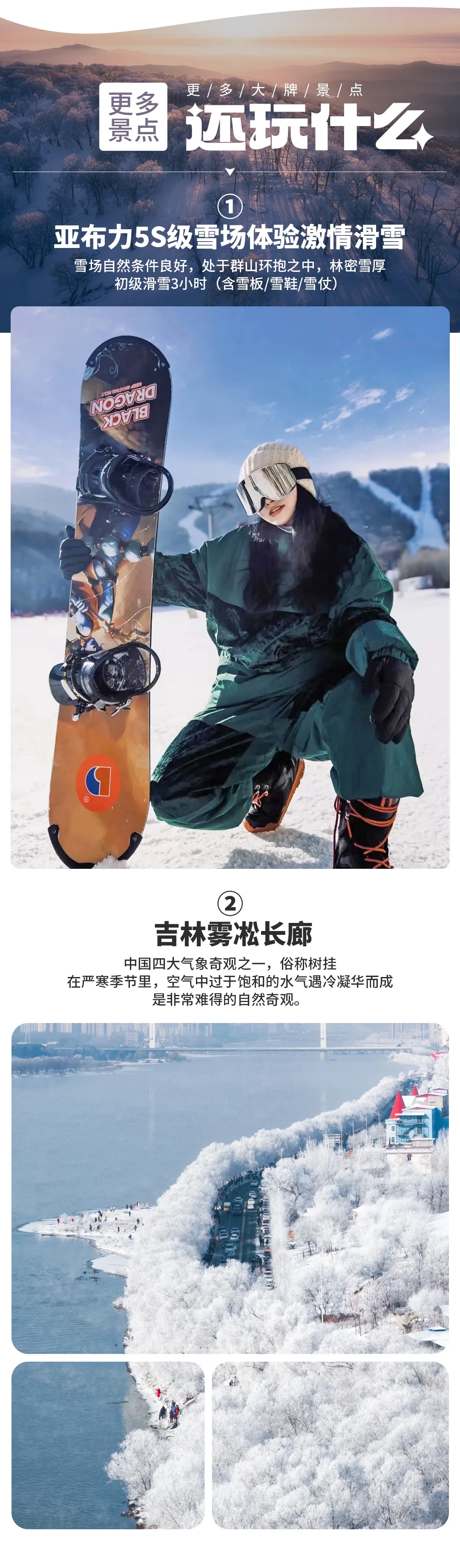 6、关于自费:东北的娱乐项目较多,主要在亚布力、雪乡、长白山。产品分为纯玩产品与自费产品,自费产品中的自费项目会披露在产品推荐项目中,自愿消费不强制;不参加的客户,请在景区附近自由活动等待。