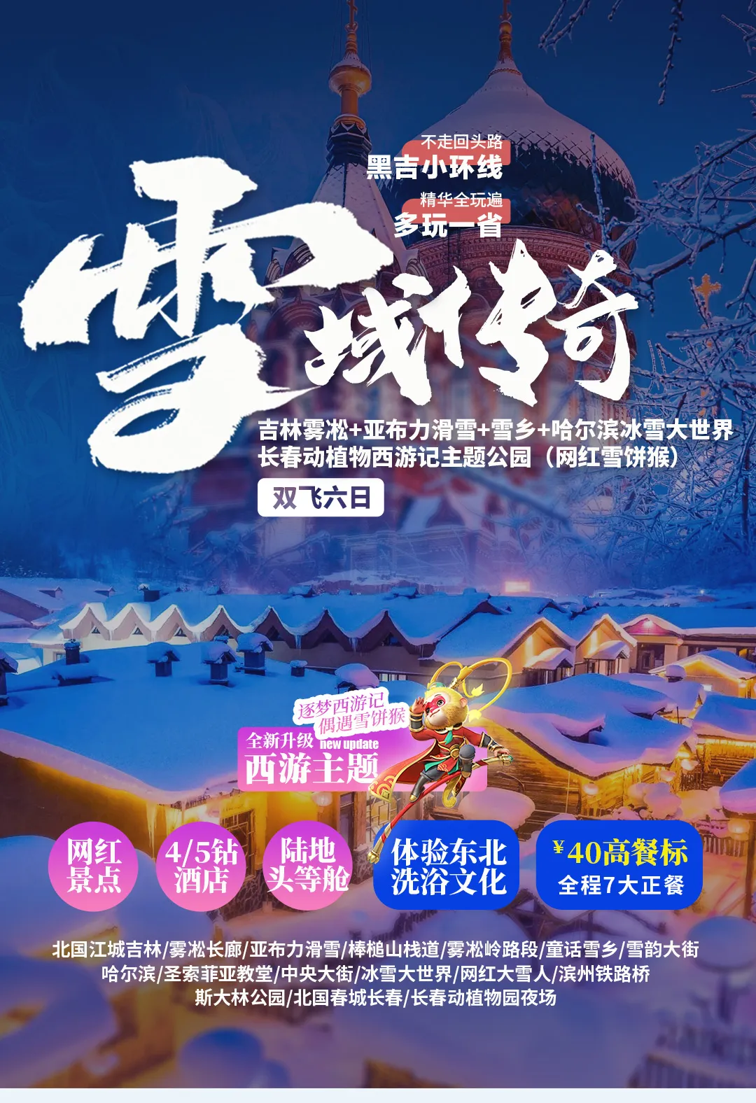 【雪域传奇】玩遍黑吉6天,2+1头等舱,3N国际五星+1N四钻+1N雪乡暖炕,东北洗浴文化&冰雪大世界&长春西游记主题“雪饼猴”超多顶流网红让你玩个够