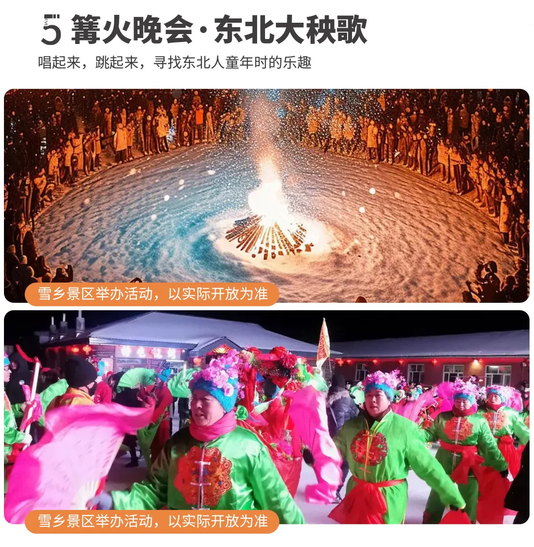 6、由于雪乡大秧歌、篝火晚会此两项活动于晚上19点开始,篝火为林业局统一组织开展,存在调整时间和风雪天气影响取消的可能,敬请以实际安排为准,为赠送项目,不参加不退费用,敬请谅解。