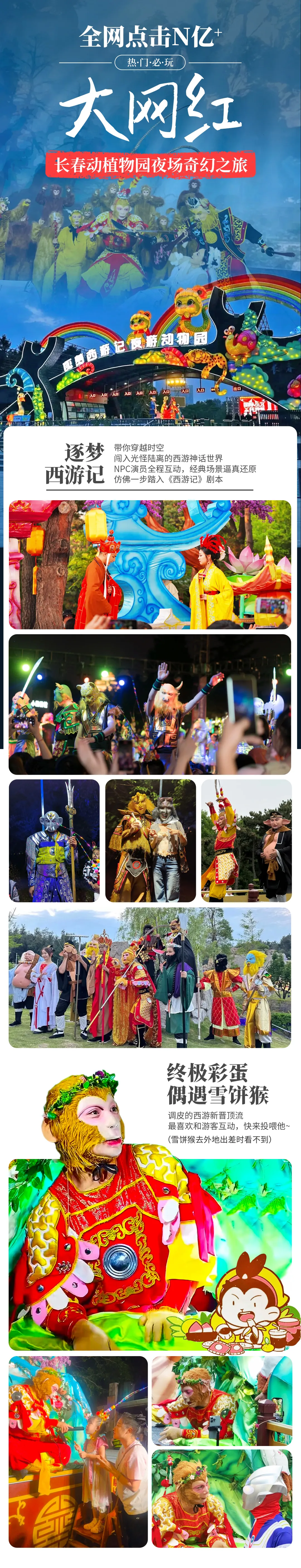 【长春动植物园夜场-逐梦西游记-偶遇雪饼猴 自由时间】当夜幕降临,逐渐灯火辉煌,夜游活动也陆续拉开帷幕。整个园区仿佛被施加了魔法,变得如梦如幻。为了在冬天增加更多体验乐趣,各个舞台都增加了互动,不但有“雪饼猴”(出差时看不到),游客还可以在“女儿国”和“唐僧”互动,在“盘丝洞”里和“蜘蛛精”互动,处处都是欢乐的海洋。(“雪饼猴”会出差,不接受因没看到雪饼猴的投诉,谢谢理解)