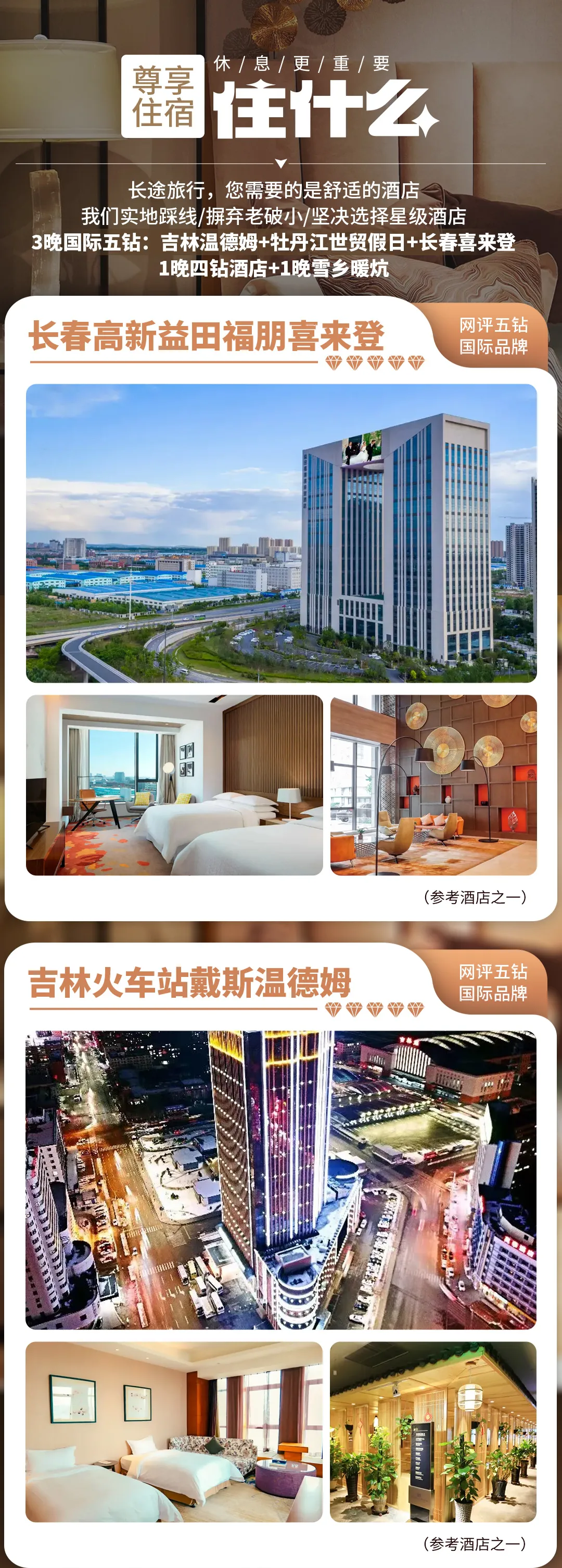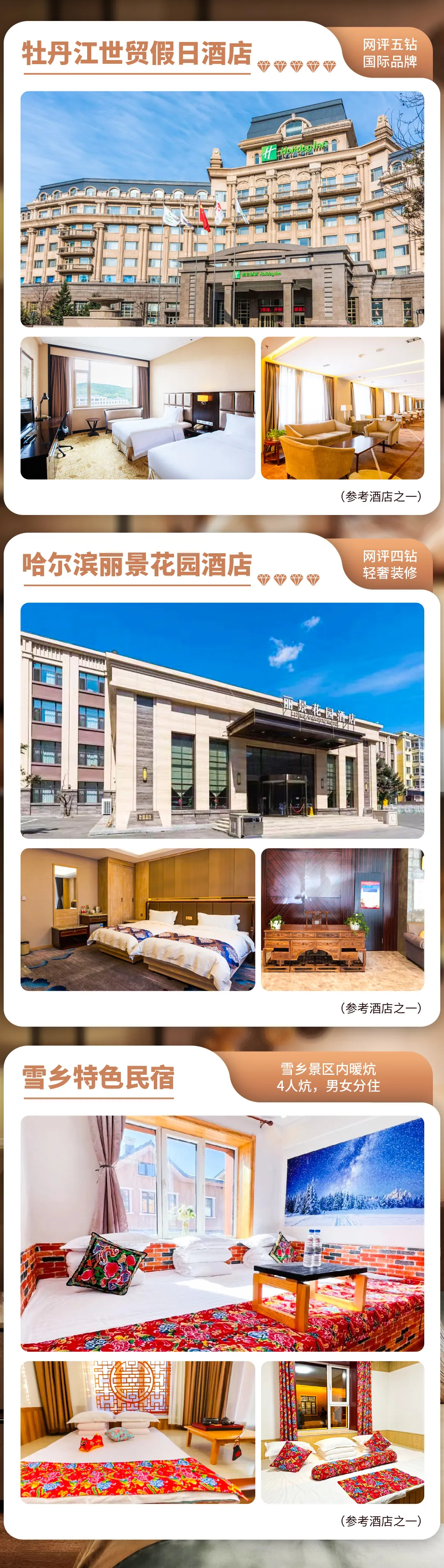 【住宿】3晚5钻酒店+1晚4钻+1晚雪乡暖炕(东北非一线发达城市,接待能力有限,我社安排当地同级标准中较好酒店,游客报名前可根据我社提供参考酒店名称提前做了解)。