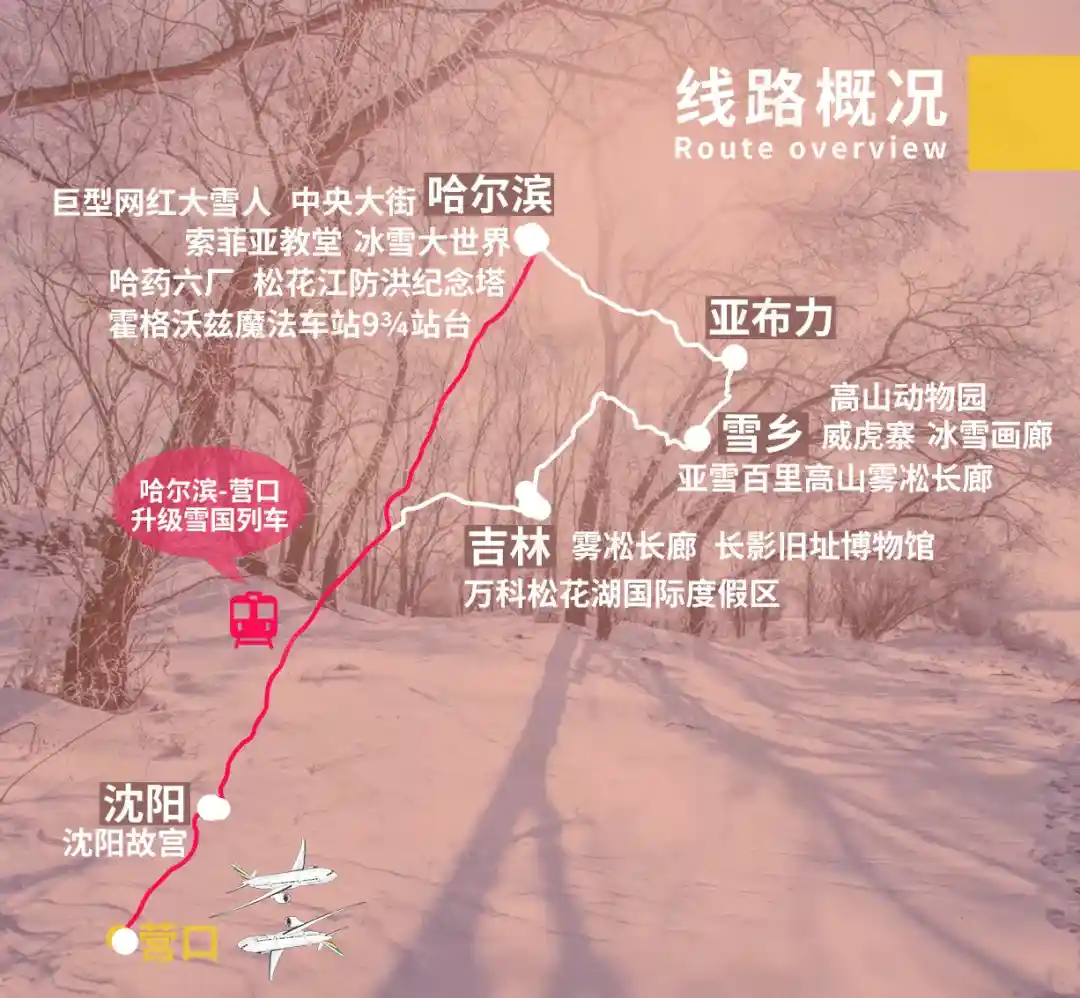 ◈之后体验我们精心为您安排的独特体验:乘坐中国首条、同时也是世界上第一条新建高寒地区长大高速铁路哈(哈尔滨)大(大连)高铁前往营口,感受冰雪极速列车的独特体验的同时横跨黑+吉+辽三省,观赏千里冰封的东北田园景色。抵达后入住酒店。