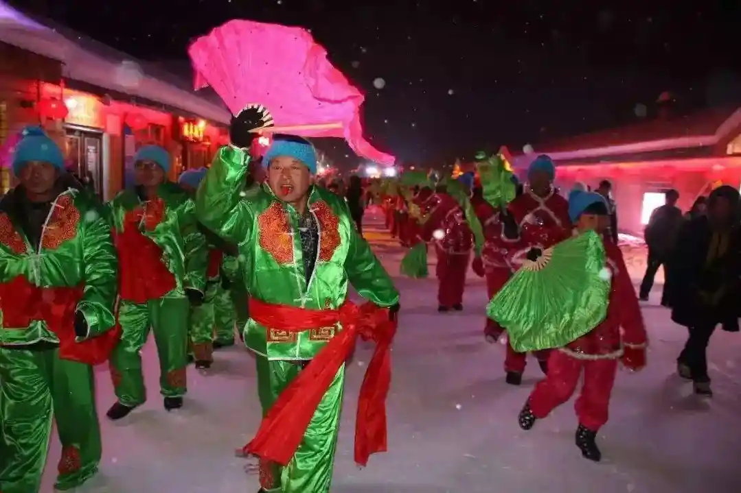 ◈在雪乡大石碑可观看【东北民俗大秧歌(赠送)】(此项目为雪乡林业局统一安排,如无法安排费用不退不换)穿上“大红大紫”的东北秧歌服装,扭在雪韵大街上,为白色的雪增添了一道亮丽的风景线可观看大型。