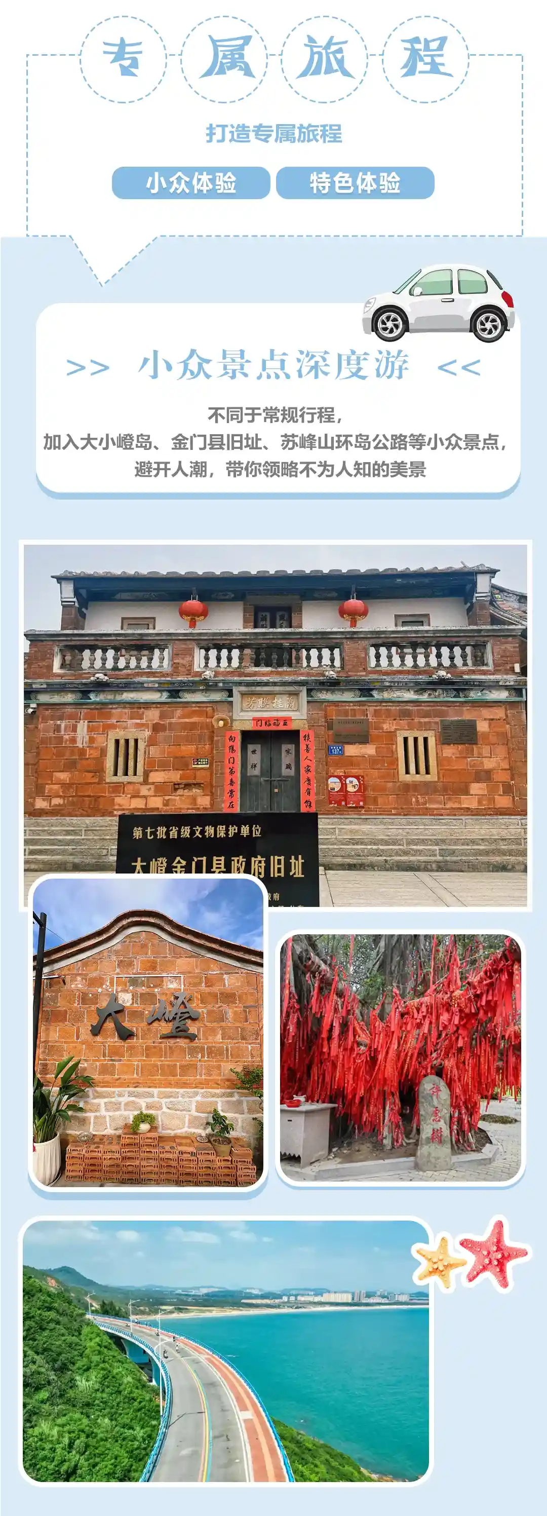 后驱车前往【金门县旧址】(游览时间约60分钟)(景交15元/人自理)由大嶝、小嶝、角屿组成,俗称“英雄三岛”。这里曾是1958年”八二三”炮战的最前方,留下了如大嶝岛的“八二三炮战阵地遗址”、小嶝岛的“303”民防工程等众多战争遗迹。小嶝岛的【大榕树许愿】是当地特色民俗文化之一。有一棵被称为“八闽铁树王”的铁树,每逢传统节日或特殊日子,当地居民和游客会来到树下,将写有名字、出生日期和心愿的红丝带或许愿卡片系在树枝上,祈求平安、幸福、财运等。