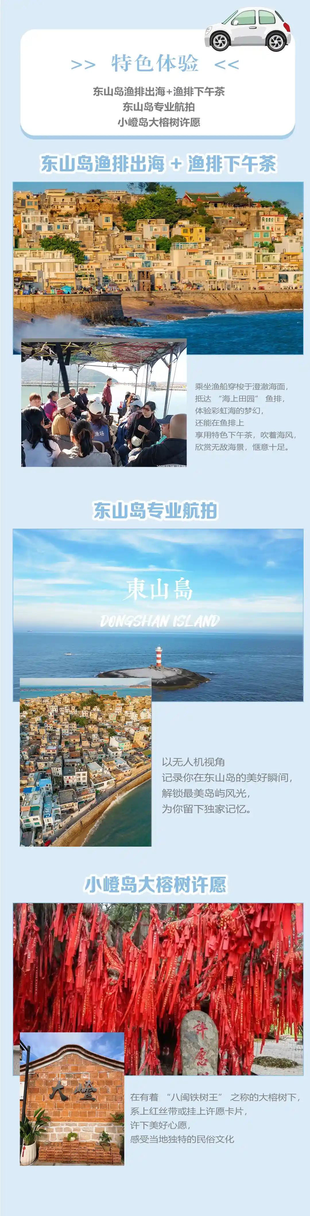 398元/人=东山岛专业航拍,解锁最美岛屿刻录您的独家记忆+东山岛乘船出海、体验渔排下午茶+小嶝岛电瓶车+泉州簪花宴+潮汕牛肉火锅+南澳岛海鲜餐+升级2晚潮汕5钻酒店!
