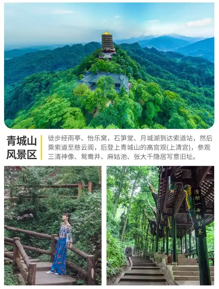 [14:00]左右游览【青城山】(门票已含,游览时间约 3.5 小时,景区配套自理:景区观光车往返35元/人、月城湖往返船票10元/人,索道往返60元/人、电子讲解耳麦20元/人)