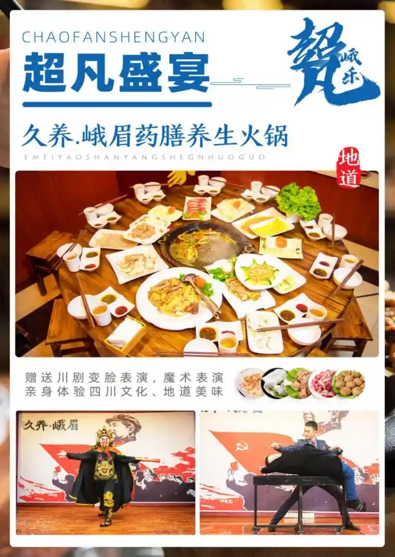 [19:00]用晚餐 晚餐品尝“久养.峨眉药膳养生火锅”,边吃边欣赏杂技表演,变脸表演等;