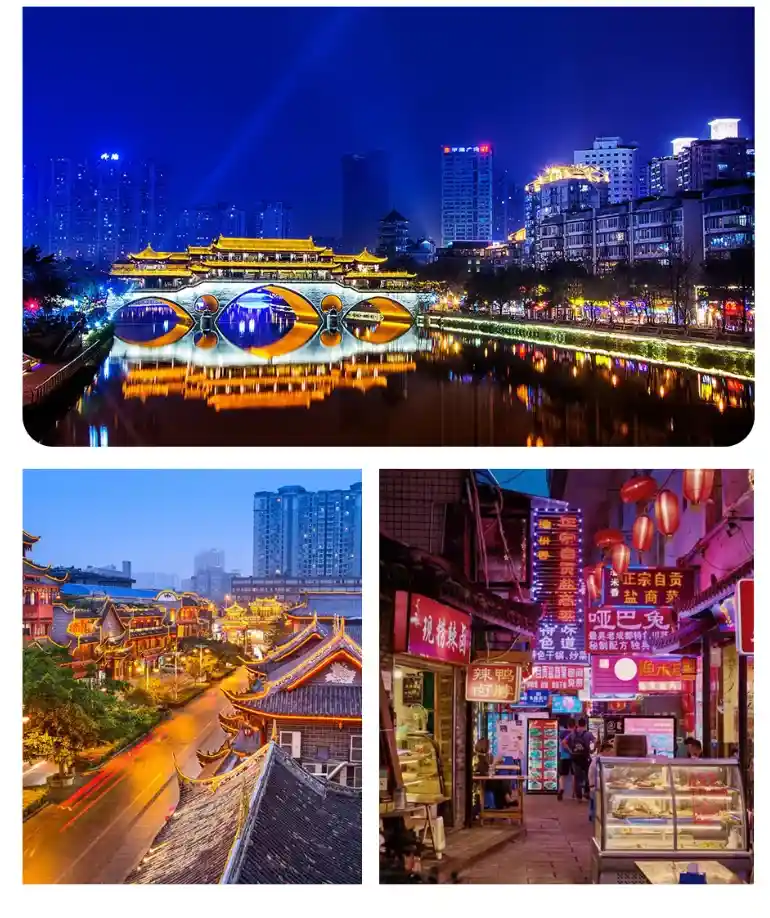 美食推荐:宽窄巷子的各类四川特色美食与小吃,春熙路-太古里的全球美食荟萃,日本料理、韩国烧烤、泰国火锅、巴西烤肉···九眼桥酒吧一条街,大到国际性的香港兰桂坊、小到地方特色的贰麻酒吧···