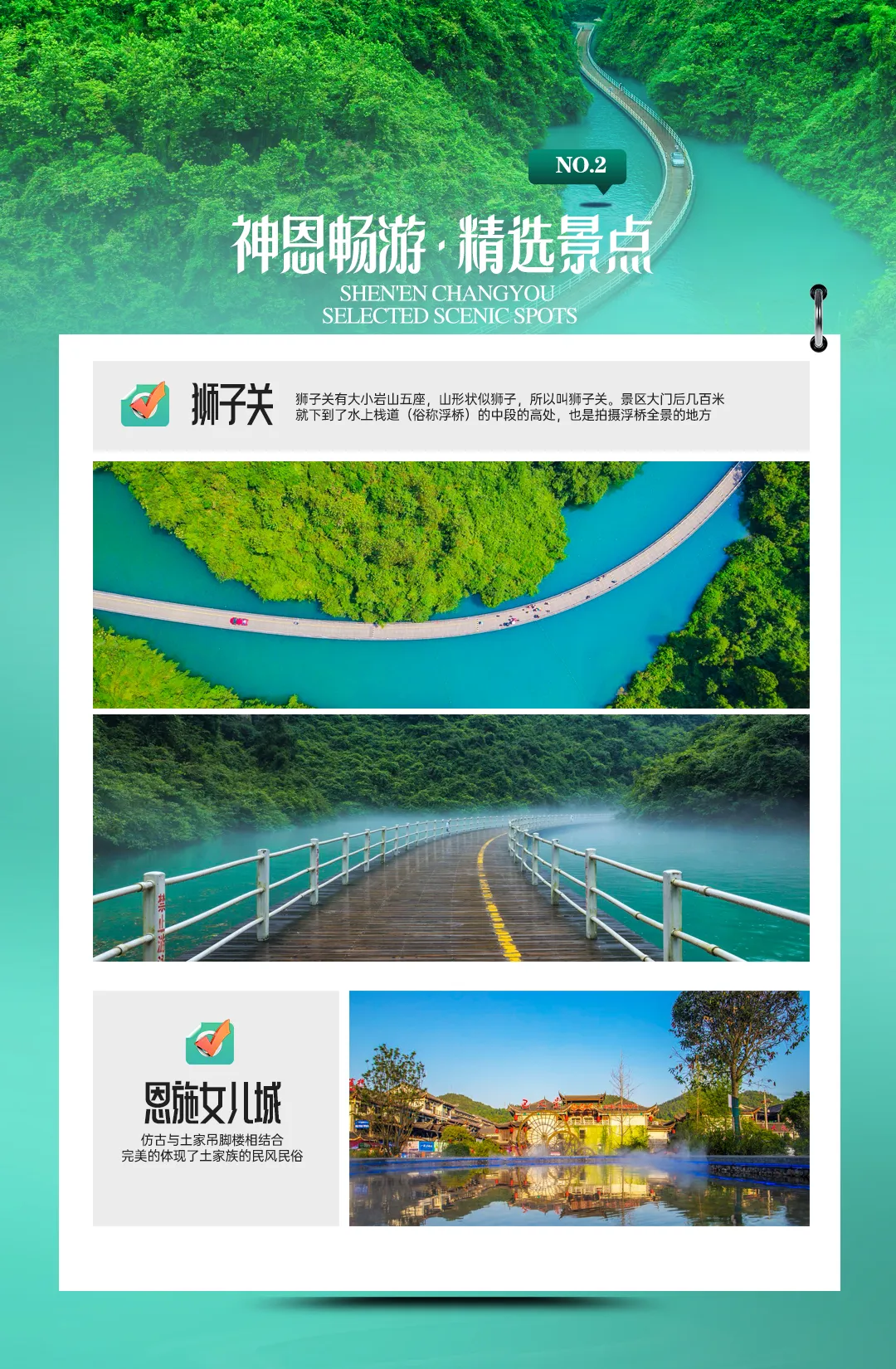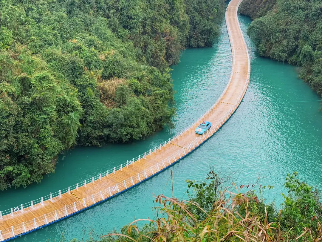 后乘车前往宣恩县【狮子关】(车程约1.5小时,游玩时间约2-3小时)狮子关有大小岩山五座,山形状似狮子,所以叫狮子关。景区大门后几百米,就下到了水上栈道(俗称浮桥)的中段的高处,也是拍摄浮桥全景的地方。从此地俯瞰下去,整条河流呈现出一道半圆弧+S形走向,就像镶嵌在两座山峰之中的绿宝石,弯弯曲曲地伸向远方,最后消失在视线之外,狮子关的四周都是峡谷,干峡谷风光带和水峡谷风光带,把景区一分为二,森林、流水,形态万千的洞穴,碧绿的水面倒影着山谷,像是一面明镜。为了去摸这一江绿水,真的是太舒服了,整个景点设计的蛮用心。