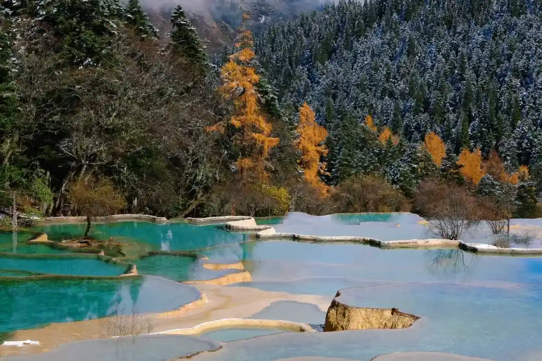 2、索道将游客送至与最高点五彩池景区海拔持平的地方,走平路(栈道)2900米到达黄龙主景区五彩池,推荐游览后沿下山栈道徒步下山,一路观看黄龙的美景,返回黄龙景区大门口。