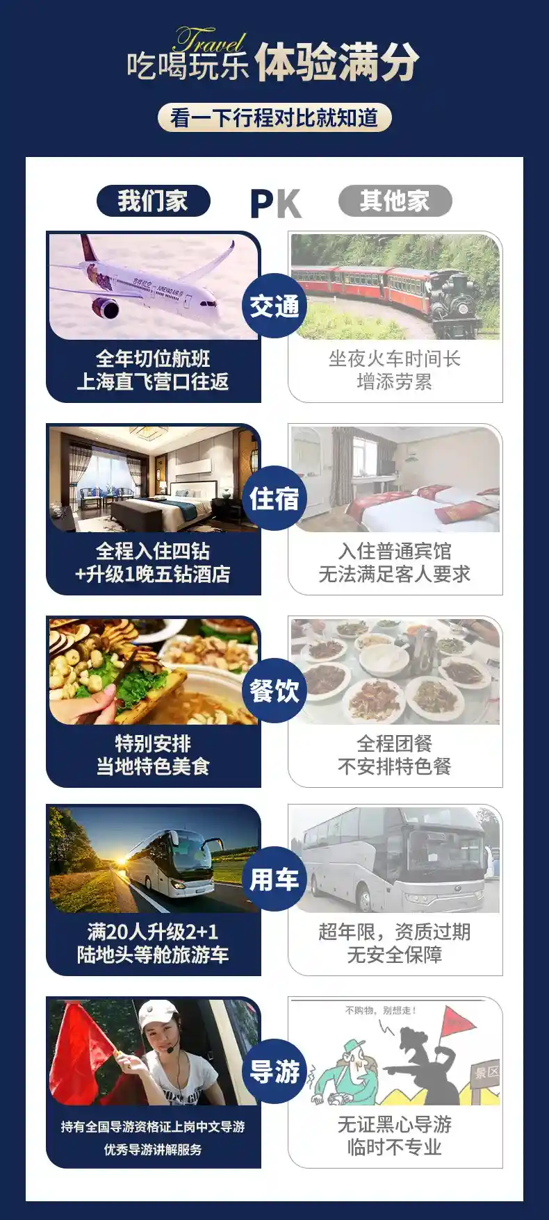 1、大交通:上海浦东-营口往返机票含20KG托运行李;哈尔滨—营口高铁二等座请务必提供准确客人名字+身份证号码。