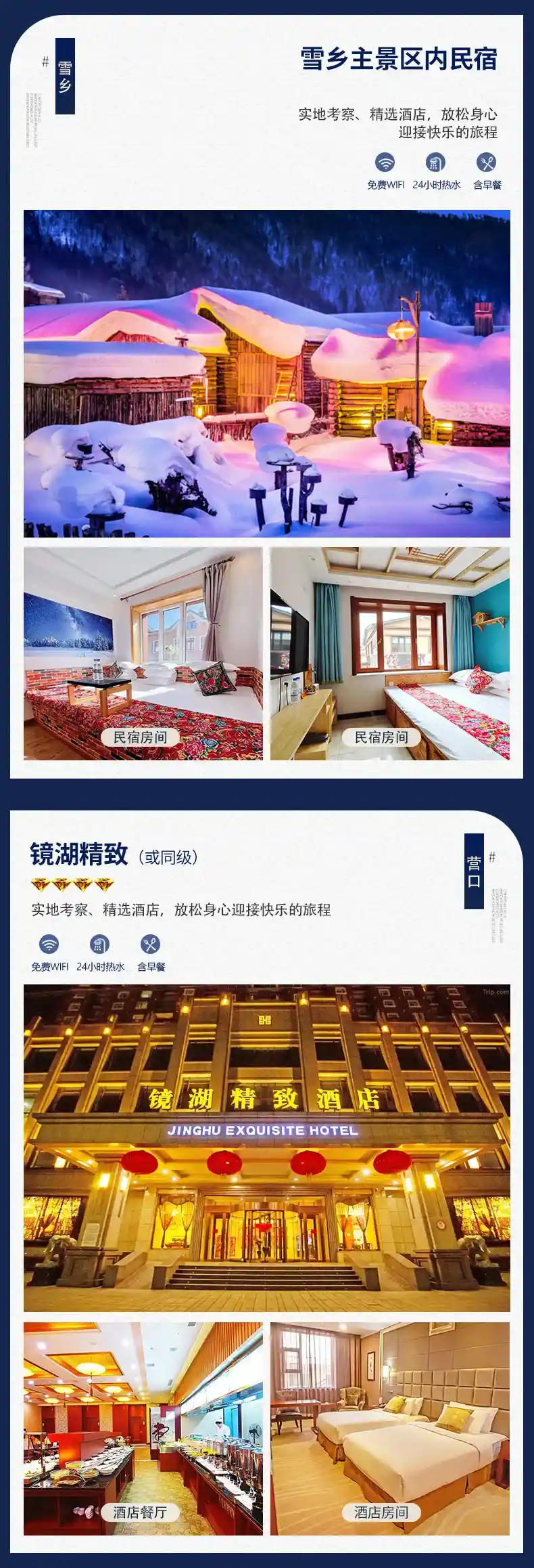 2、全程参考酒店:全程酒店双人间+雪乡主景区内民宿,如有房型特别要求,请提前说明。