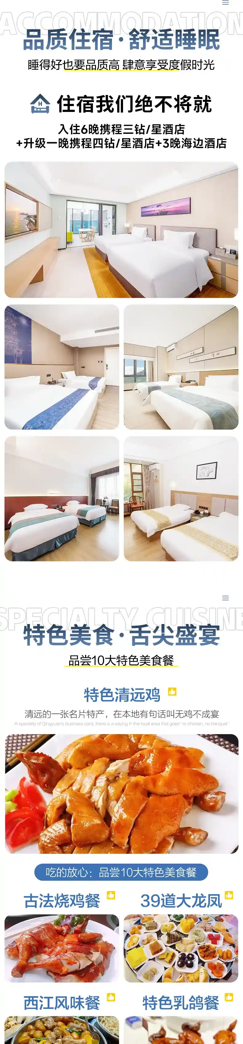 ⒉用餐:全程10早10正,因个人原因不用,餐费不退!(特色清远鸡.古法烧鸡餐.39道大龙凤.西江风味餐.特色乳鸽餐.海鲜大盆菜.巽寮海鲜餐.牛肉火锅.潮汕鹅肉餐.客家风味餐)【正餐30元/顿,以10人桌8菜1汤为标准(不含酒水)不用不退,人数减少相应递减安排菜品数量,早餐为打包早或围早】