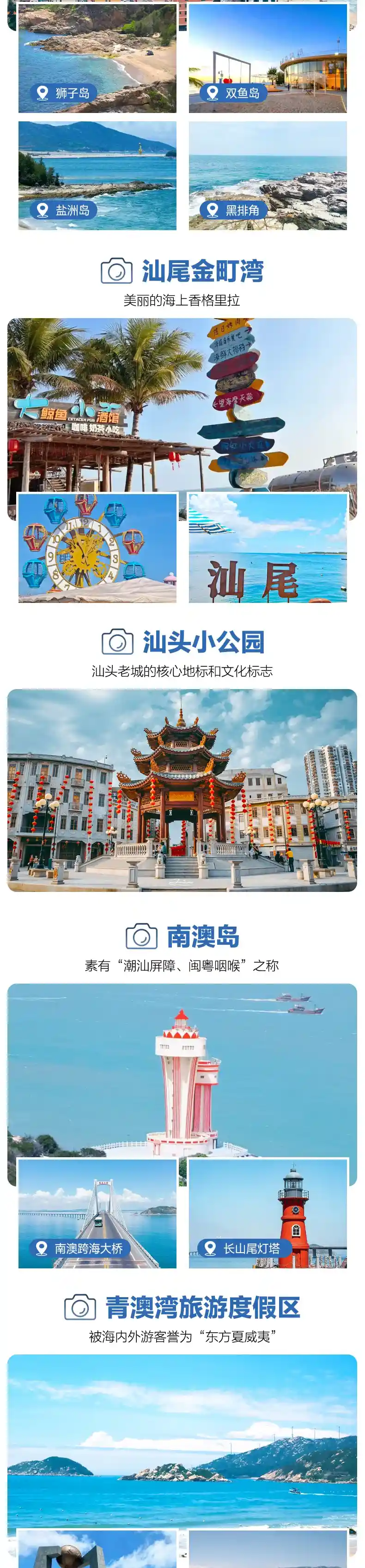 ●前往广东省唯一的海岛县【南澳岛】也是汕头市的唯一辖县,处于高雄、厦门、香港三大港口的中心点,背靠汕头经济特区,素有“潮汕屏障、闽粤咽喉”之称。具有“海、史、庙、山”相结合的立体交叉特色,蓝天、碧海、绿岛、金沙、白浪是南澳生态旅游的主色调。