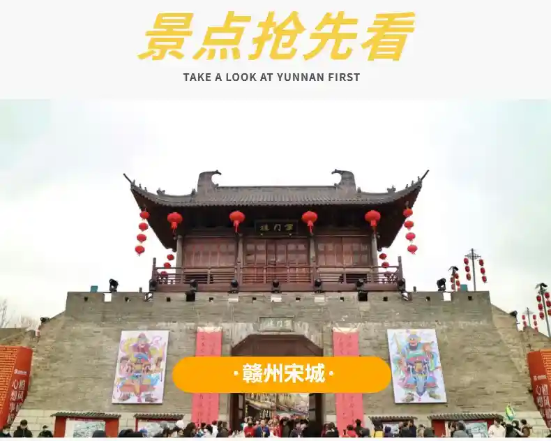 ■下午:【赣州宋城】又名江南宋城古城墙(魏家大院+灶儿巷+古浮桥+八镜台+古城墙 蒋经国旧居+郁孤台):位于赣州市内,始建于汉代,距今有二千年的历史,后米经过南宋、元、明、清、民国,历时 900 多年的不断修缮、加固,使赣州城形成了一道周长13华里,高大雄伟的城墙,现保存较完整的古城墙建于北宋嘉佑年问,是江南现存规模最大的古城墙,也是全国屈指可数的北宋砖墙之一。城墙平均高了米,从东门至西门长3.6公里,垛墙、炮城、马面、城门都保存完好。 虽经岁月更迭,风雨侵蚀仍紧紧地环抱守护着赣州古城,1996 年被列入全国重点文物保护单位。江南宋城历史文化旅游区拥有民俗店铺、文创艺术馆,独具赣州市井风情的“宋潮街市坊”“客家艺术坊”等特色景观,是一个集历史人文体验、商旅融合为一体的夜间经济新集聚区。