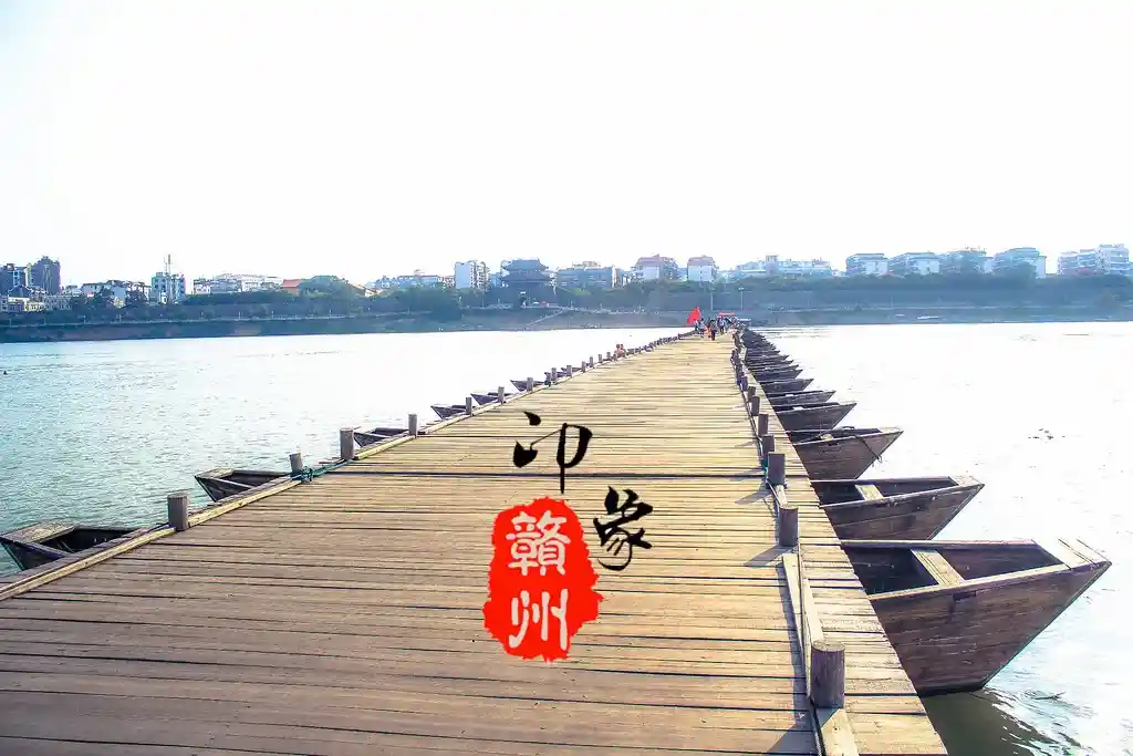 赣州古浮桥:赣州古浮桥,学名叫惠民桥,又称东津桥、东河浮桥,位于赣州市章江区,是赣州市 的“国宝”级文物。浮桥长约400米,连接贡江的两端,由100多只小舟板并束之以缆绳相连而成。整 座浮桥分为33组,用缆绳把它们连接起来,然后用钢缆、铁锚固定在江面之上。赣州古浮桥始建于宋 乾道年间(1163—1173),己有800多年历史。赣州古浮桥使用了100多个木舟并列,并以绳索相连固定在江面之上。赣州古浮桥经历无数次战火硝烟,于1958年再次修复延续至今。