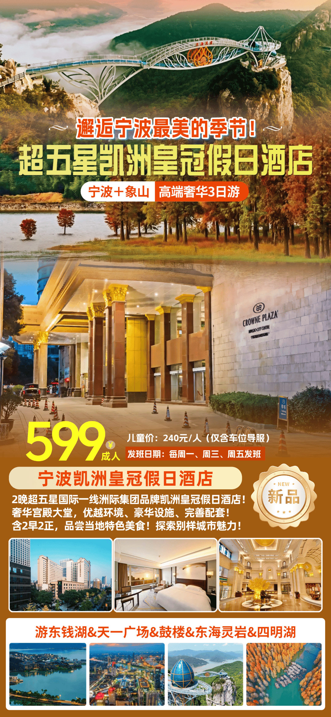 ▲住宿:宁波凯洲皇冠假日酒店或同级(如产生单房男、女,补房差:380元/人)