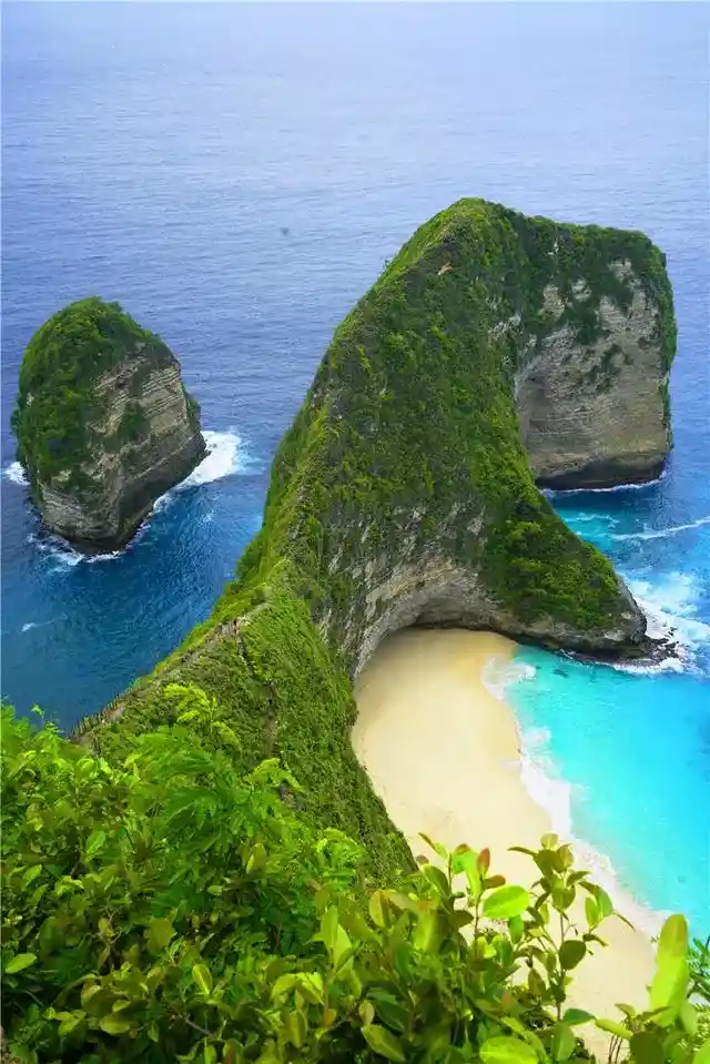 --【Kelingking Beach精灵坠崖沙滩】天然形成的悬崖,因为特别的形状而惹人注意,山崖之下是绝美的无人沙滩,海水的蓝色渐变,美的无法用言语形容,也是苹果手机壁纸取景地。有一条小路可以下到沙滩,这里也是外国游名的打卡点哦。