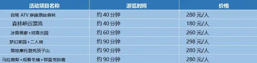 长白山摆渡车35、环保车85、长白山倒站车80、镜泊湖30(3次)、雪乡15、亚布力全景缆车280