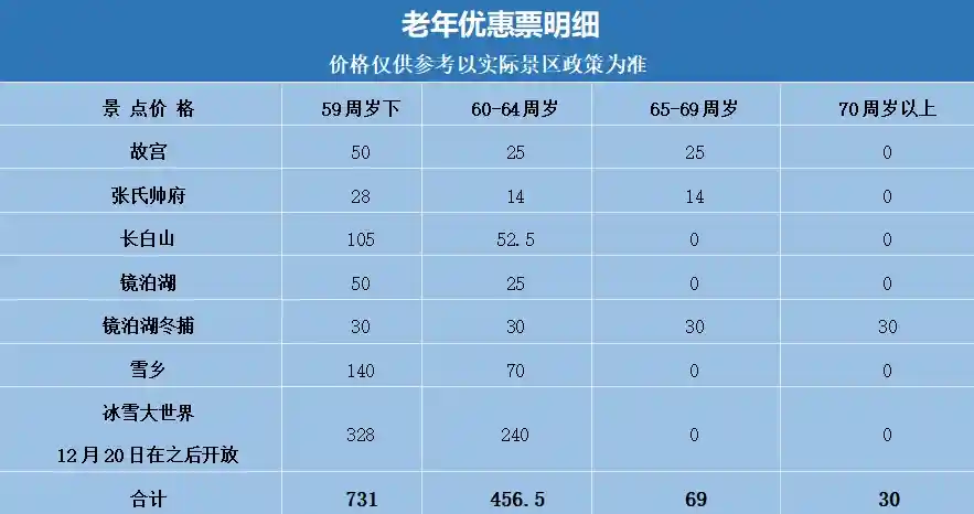 全程自理根据各地景区、景点对不同年龄段老年游客的优惠政策,我们把各景区不同年龄段的收费标准列表如下(以下门票仅供参考,届时以实际为准)