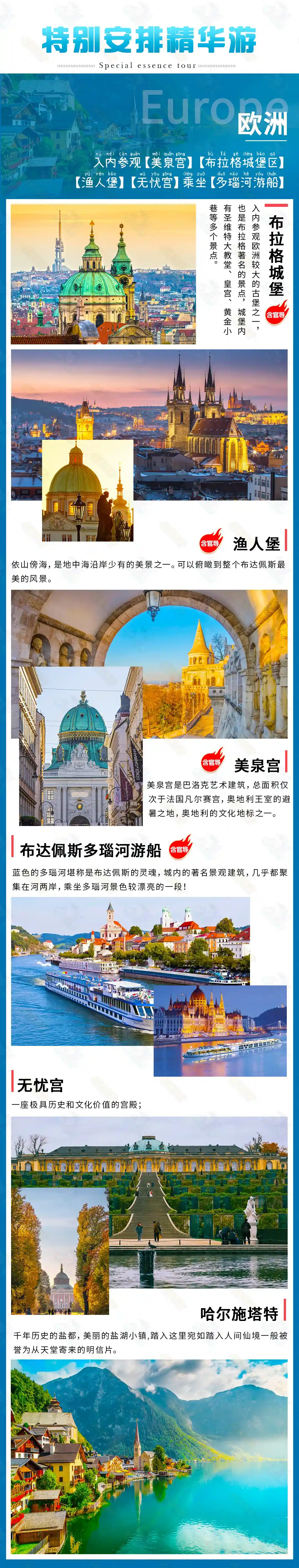 【门票】行程中所列景点标*符号入内参观,其余均为外观;(布拉格城堡区、无忧宫、美泉宫、渔人堡、多瑙河游船)