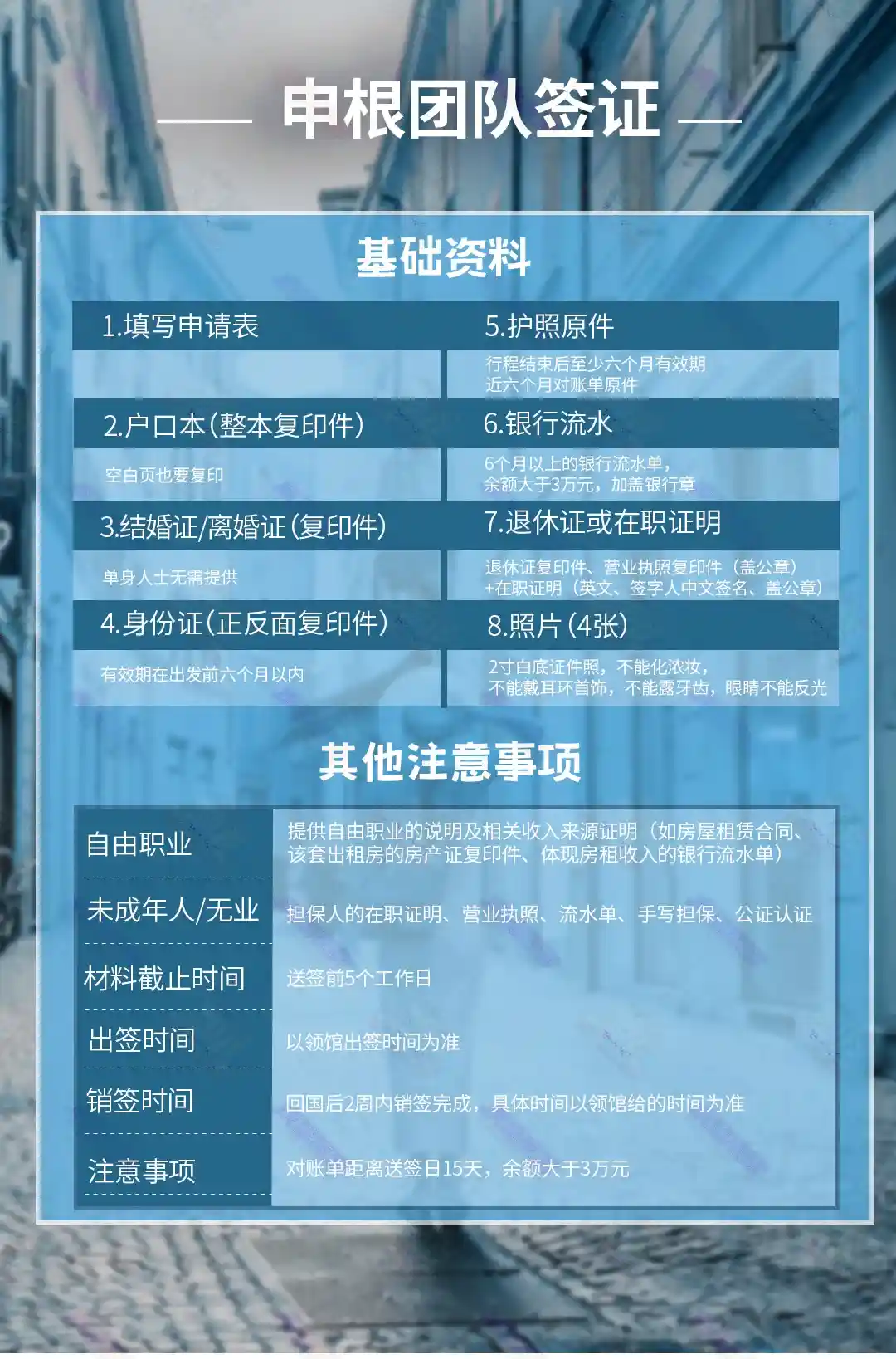 6、温馨提示:有时使馆会抽查团队客人进行面试销签。使馆通知可能会在出团前、旅行途中、回国后不等,请客人予以理解并做好准备,且所有面试销签相关费用均由客人自理;