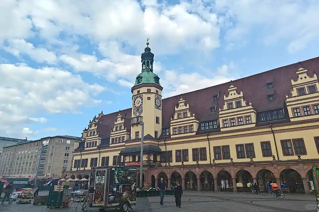 ◈酒店早餐后,游览【莱比锡】(游览时间约1小时)【老市政厅】较早建于1556年,二次世界大战中被毁,现存者为战后重建。内部现为莱比锡历史博物馆对公众开放。它共分三层,下面是棕红色石材砌筑的拱廊,中间为简洁的黄色墙身,上面是红瓦斜坡屋顶。屋顶上还建有6座造型优美的高阁楼,阁楼中间高耸的钟塔是广场的中心标志。